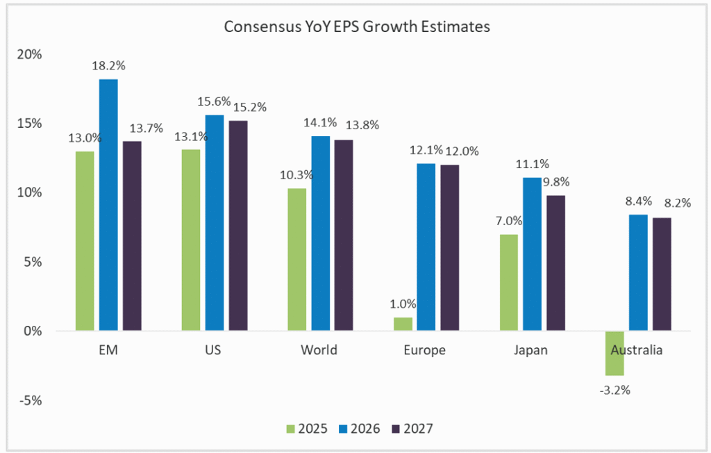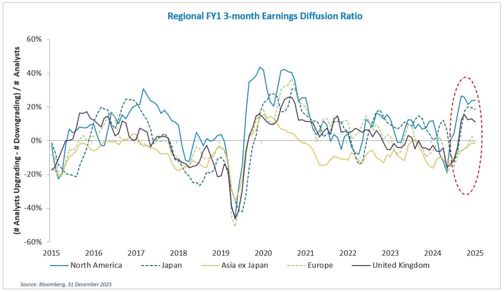 Source: Morgan Stanley.Anything-but-AI:AI has been the focus of investors for over two years now. Many traditional non-technology stocks have been left behind and de-rated. At some point in the future, momentum behind AI spending will inevitably slow. Hence, investors will need to look for the "anything-but-AI" investment. EM, in particular Asian equities, can be a fertile hunting ground for new ideas. Earnings are expected to grow strongly (17% YoY) in 2026 in Asia ex-Japan. Figure 11: Asia ex-Japan forward earnings growth forecasts are strong and expected to stay high in 2026