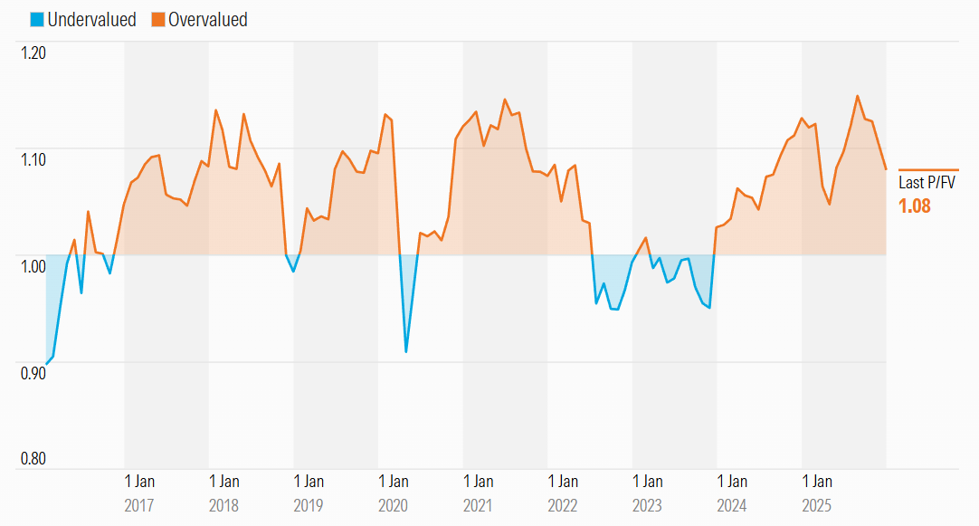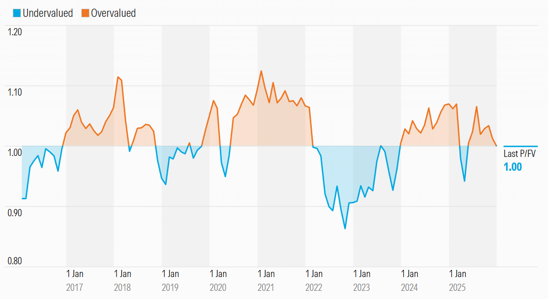 Source: Equitable Investors A custom US debt market sentiment score - based on 10 year bond yield and MOVE Index of implied volatility relative to their historical average and volatility Source: Equitable Investors Market price relative to US market bottom-up valuations from Morningstar Source: Morningstar Market price relative to ASX market bottom-up valuations from Morningstar