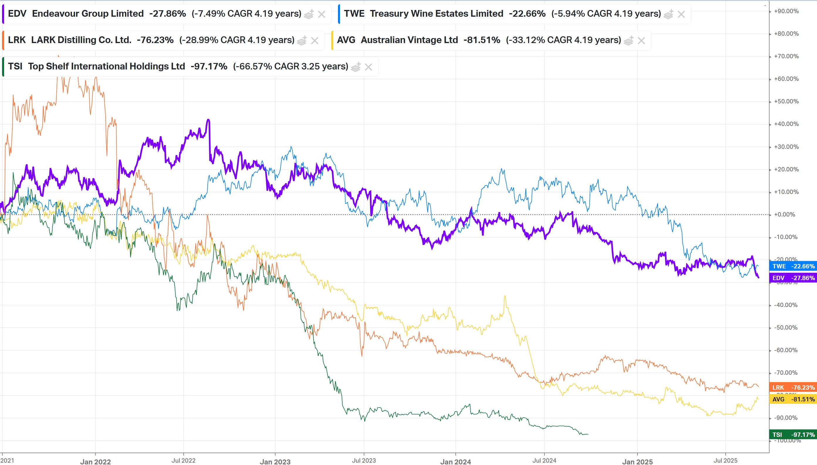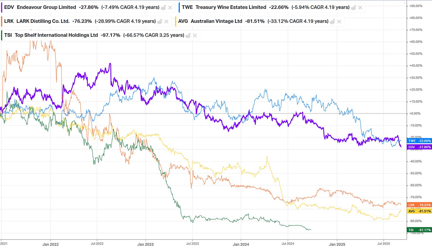 Source: IFM Investors Australian household spending - alcohol & tobacco has been in decline for ~24 months Source: Evans & Partners Performance of ASX-listed alcohol stocks