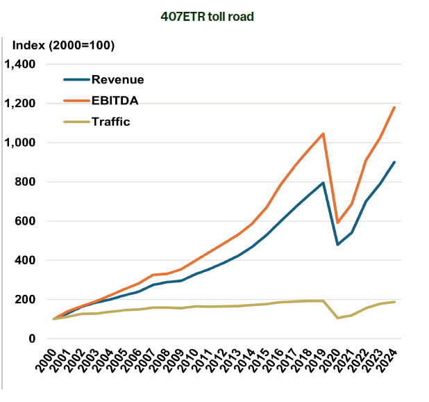 Source: Bloomberg. Magellan. The numerical information above is based on a representative portfolio. The representative portfolio is an account in the Global Core Infrastructure AUD Hedged Composite that closely reflects the portfolio management style of the strategy. Subsequently, in 2022-2023, when there was an inflation surge and sharp rises in interest rates, the average yield was maintained in this range. We see similar patterns in economic cycles further back in time. For example, in the global economic upswing in 2015-2016, which saw commodity prices rally, our portfolio again recorded an average dividend yield in the 3.5%-4.0% range. These examples highlight the stability of divided income yields to investors. The yield returned is consistent and largely unaffected by market cycles. Even in significant upswings and downdrafts, the yield does not deviate much from the long-term average of 4.0%. This is important, as it highlights the role of high-quality listed infrastructure as a diversifier in an investor's portfolio. Stable businesses support stable dividends Infrastructure companies can deliver consistent dividends because of the nature of their underlying assets. Fundamentally, infrastructure businesses provide essential services, which support predictable demand and income (for example, water services, or electricity). Earnings are typically secured in a regulated or non-competitive structure. For example, the Magellan Global Listed Infrastructure strategy invest in companies with the bulk of earnings (75% or more) sourced from high-quality infrastructure businesses that are predominantly natural monopolies or concession-driven businesses. Demand for the services these assets provide is typically stable. At the same time, many of these businesses have a regulated component to their earnings, which varies in its breadth but provides another parameter for certainty on earnings. This includes the regulated revenue allowance for utilities, regulated toll increases for toll road operators and regulated aero revenues for airports. As a result, these companies have a relatively stable cash flow profile. To see what this looks like in practice, let's look at a few sub-sector examples. Toll roads illustrate this well, offering captive traffic flows and consistent revenue and earnings growth and reflecting operating leverage in their business model. The 407ETR toll road in Canada, owned by Ferrovial, is another example, shown in the chart below. This road, like other high-quality toll road assets, captures the bulk of growth in traffic in its catchment. With the competing free road typically full at peak travel times, the toll road provides users with shorter transit times, with the added benefit that the concession allows for peak pricing and for different tolls for different segments based on demand.