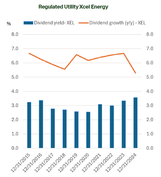 Regulated utilities show a similar dynamic, with their earnings linked to the growth of their regulated asset base. These companies invest in new projects, with spending approved by their regulator, to meet growing power demand, improve asset resilience, or upgrade existing infrastructure. These companies then typically earn an agreed rate of return on this asset base - of around 9.0%-10% for US integrated power companies like Xcel Energy and WEC Energy. High-quality airports (such as European airports including Aena) operate in regimes that entitle the operating company to earn predictable returns. This includes an entitlement to earn a fair rate of return on invested capital for aviation activities and provisions for minimum annual guarantees for commercial activities, such as retail. Looking at these examples, we can see that well-defined infrastructure companies have the advantage of high barriers to entry, pricing power and a regulated operating environment. These conditions allow these companies to have stable revenue linked to their asset base rather than to the business cycle. Under this distinct model, infrastructure companies can then pay predictable distributions to investors. Secular trends drive yield generation This is a snapshot of the translation of predictable demand and high-quality businesses into dividend yield at a point in time. Over time, there are clear catalysts for these companies to continue to generate yield, providing for durable returns to investors over an investment cycle. In simple terms, steady growth in earnings over time can support higher dividends. The dividend yield can therefore comfortably hold ground for these companies, at around 4.0%. Major secular trends in the market at any given time can be linked directly to the ability of infrastructure companies to generate predictable earnings over the long term. The rise of AI and ongoing demand for renewable energy generation are two such major trends. AI is expected to push electricity demand higher for years to come. That gives integrated utilities room to invest more, expand their asset base, and earn more on that capital. These allowable returns ultimately underpin dividends to investors. The resilience of renewable energy investment, reflecting improving cost competitiveness, also translates into greater capital investment for integrated utilities and transmission and distribution companies. As these are regulated utilities, we see robust growth in capex again driving solid earnings growth over the longer term. Historically, this earnings growth has translated into dividend growth for investors (for example, with US regulated utilities typically recording 5.0-7.0% EPS growth, and similar dividend growth), which also helps to sustain dividend yield over time. This is shown in the chart below for regulated utility Xcel Energy. The company demonstrates consistent dividend yield and dividend growth in the range of 5.0-7.0%, which is in line with its earnings growth over the last decade.